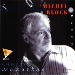 Michel Block, PianoChopin: MazurkasFédéric Chopin (1810 - 1849): 22 Mazurkas· Op.67 No.3 (posthumous) in C Major · Op.68 No.3 (posthumous) in F Major · Op.68 No.4 (posthumous) in F Minor · Op.17 No.4 in A Minor · Op. 7 No.2 in A Minor · Op. 7 No.3 in F Minor · Op.41 No.1 in C-sharp Minor · Op.41 No.2 in E Minor · Op.24 No.1 in G Minor · Op.24 No.4 in B-flat Minor · Op.30 No.4 in C-sharp Minor · Op.50 No.1 in G Major · Op.50 No.2 in A-flat Major · Op.50 No.3 in C-sharp Minor · Op.56 No.1 in B Major · Op.56 No.2 in C Major · Op.56 No.3 in C Minor · Op.59 No.1 in A Minor · Op.59 No.2 in A-flat Major · Op.63 No.2 in F Minor · Op.63 No.3 in C-sharp Minor · Notre Temps, No.2 in A Minor Chopin: Op.67