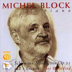 Michel Block, PianoRobert Schumann (1810 - 56): Novelletten, Op.211. Markirt und kräftig - Trio 2. Äusserst rasch und mit Bravour - Intermezzo. Etwas langsamer durchaus zart - Erstes Tempo 3. Leicht und mit Humor - Intermezo. Rasch und wild - Erstes Tempo - Adagio 4. Ballmässig, Sehr munter - Noch schneller - Erstes Tempo 5. Rauschend und festlich - Etwas langsamer - Etwas langsamer - sehr lebhaft - Erstes Tempo - Tempo I 6. Sehr lebaft, mit vielem Humor - Immer schneller und schneller - Tempo I 7. Äusserst rasch - Etwas langsamer - Erstes Tempo 8. Sehr lebhaft - Trio I. Noch lebhafter - Adagio - Wie früher - Trio II. Hell und lustig - Tempo I - Stimme aus der Ferne - Fortsetzung. Einfach und gesangvoll - Adagio - Tempo wie im vorigen Stück - Adagio - Fortsetzung und SchluB. Munter, nicht zu rasch - Nach und nach lebhafter - Tempo I - Adagio 3 Encores Claude Debussy (1816 - 1918) 9. Serenade for the Doll from "Children's Corner" 10. Quelques aspects de "Nous n'irons plus au bois, " parce qu'il fait un temps insupportable from 'Images (oubliées)' Barbara (1930 -) - Michel Block 11. Ma plus belle histoire d'amour Robert Schumann: